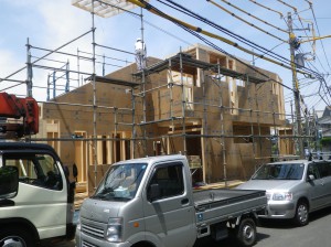 今回の建て方は工場製作のパネルで立ち上げました。広い場所があると出来るのですけどね。これから、内装大工ががんばって行きます。