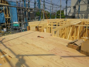 屋根が複雑です。出来上がりが楽しみですが、大工さんなかせのお家です。ガレージのあるお家です。