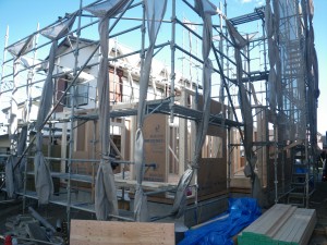 1階の壁パネルを施工しています。2X4工法です。だんだん立ち上がって行きますね。