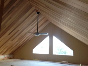 リビング天井も米杉(レッドシダー)が張れ、素敵さがましました。もうじき大工工事も完了です。